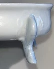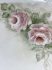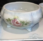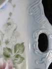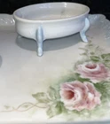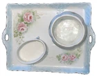 Hand Painted Porcelain 3 Piece Dresser Set - Floral Pink Roses Blue Trim. This gorgeous very feminine set is in excellent condition. It does have some glue spots of the underneath side of the tray where it seems felt pads had been removed. The tray is 10 3/4 x 8 3/4 inches.