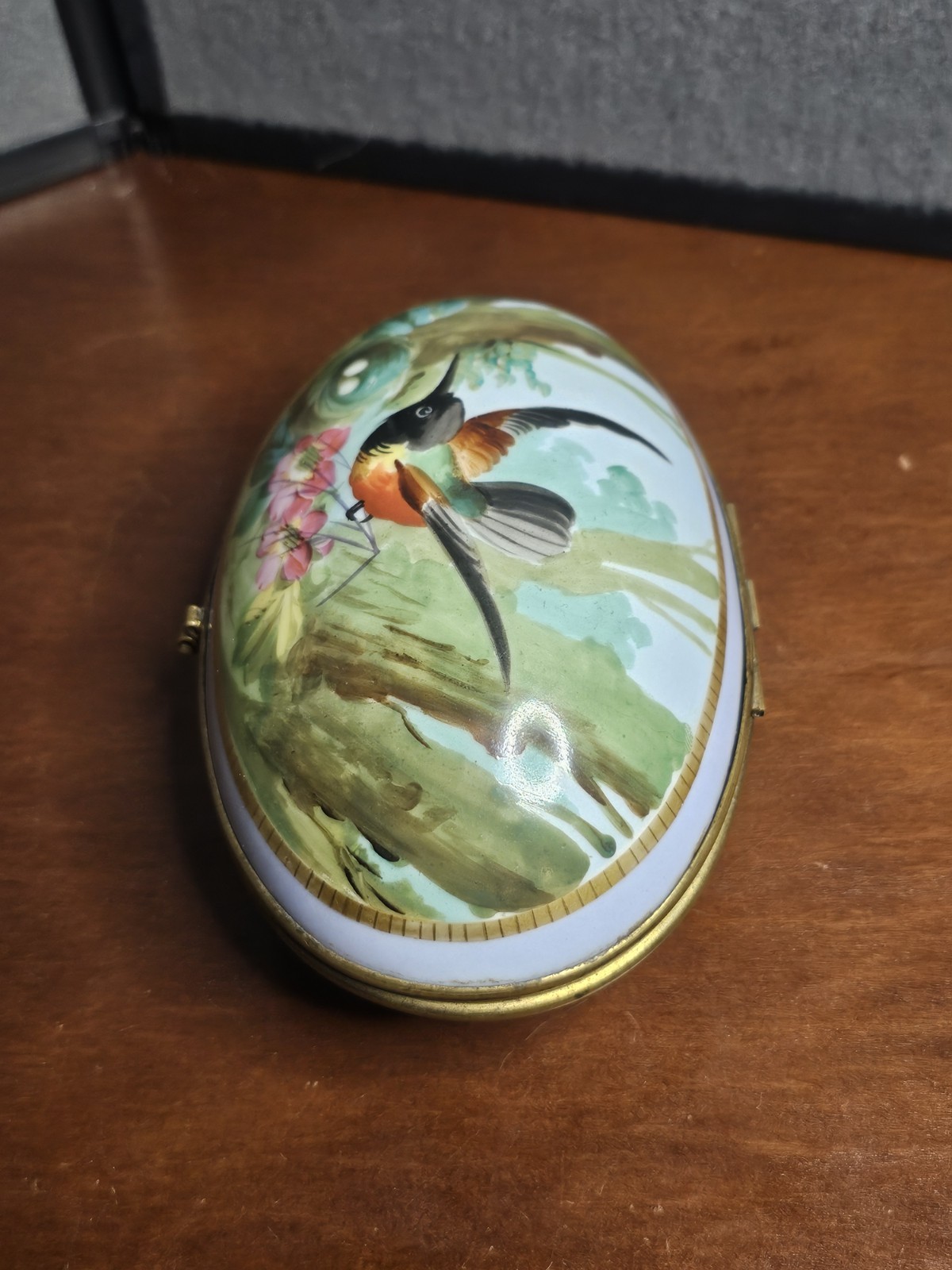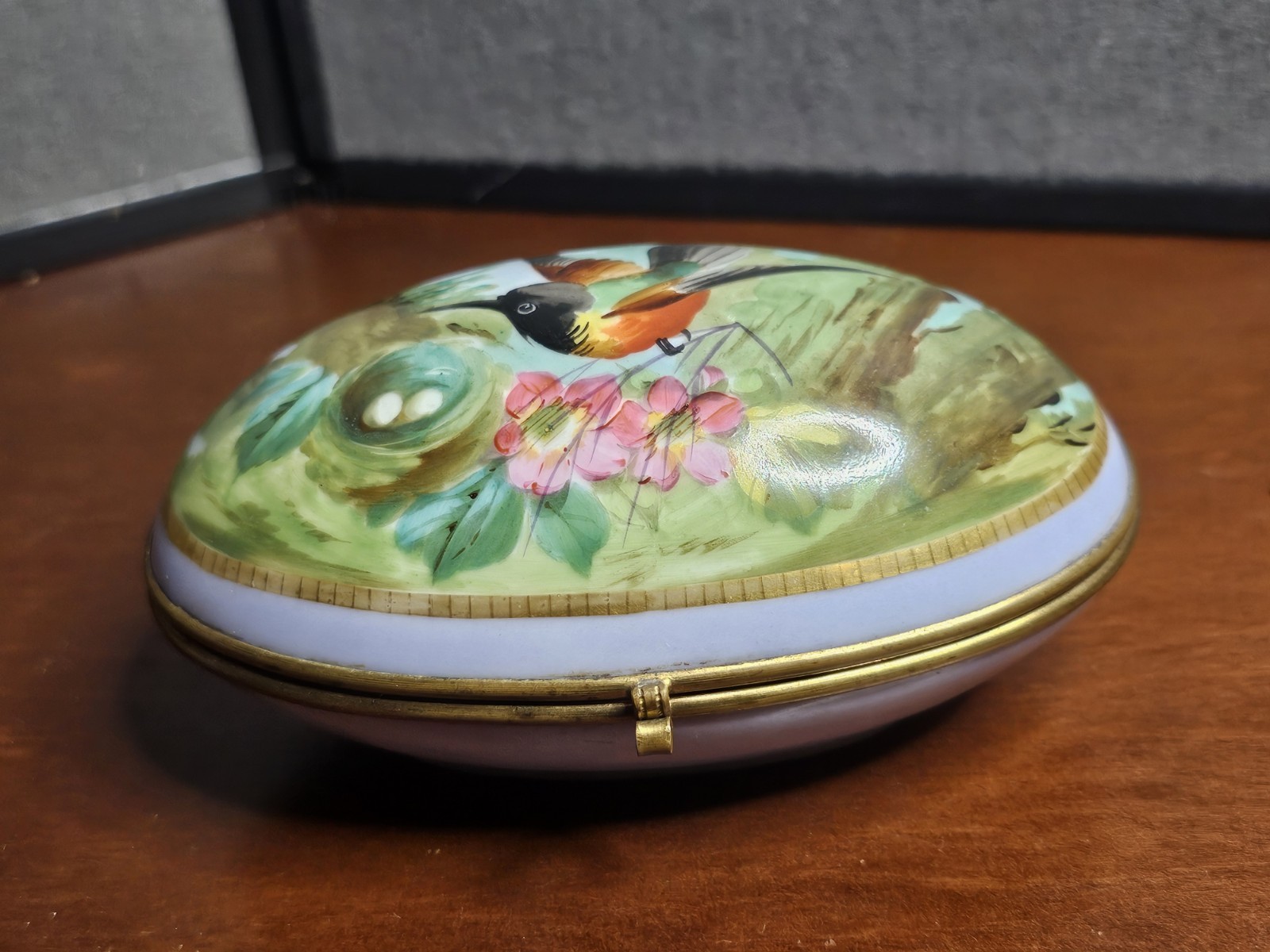 Vintage Porcelain Egg Shaped Oval Trinket Box HandPainted Nest And Bird Scene Measurements About 6 inches long 4 inches wide And 3 inches tall Weighs about 15 ounces