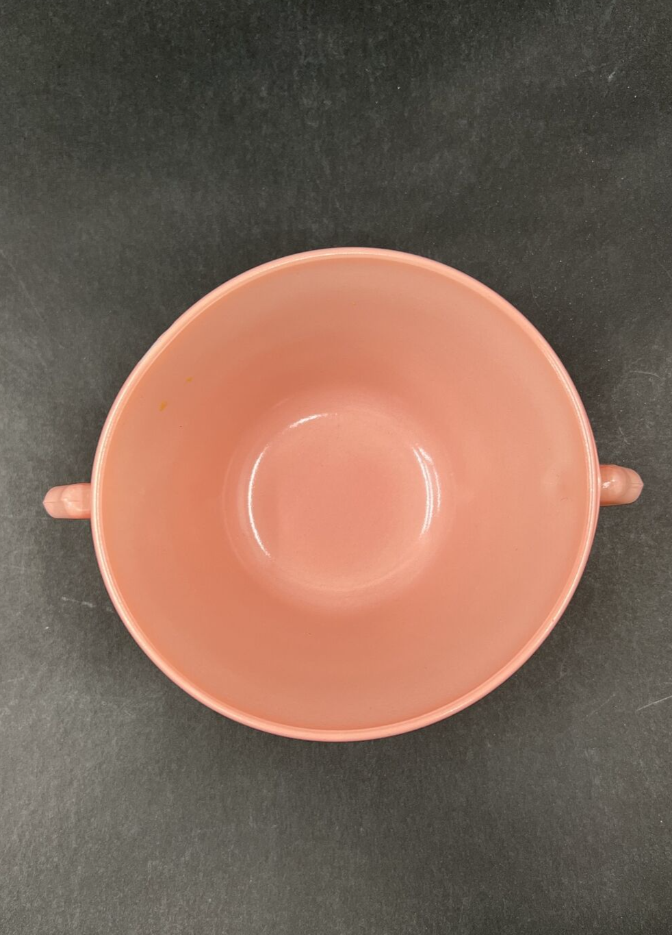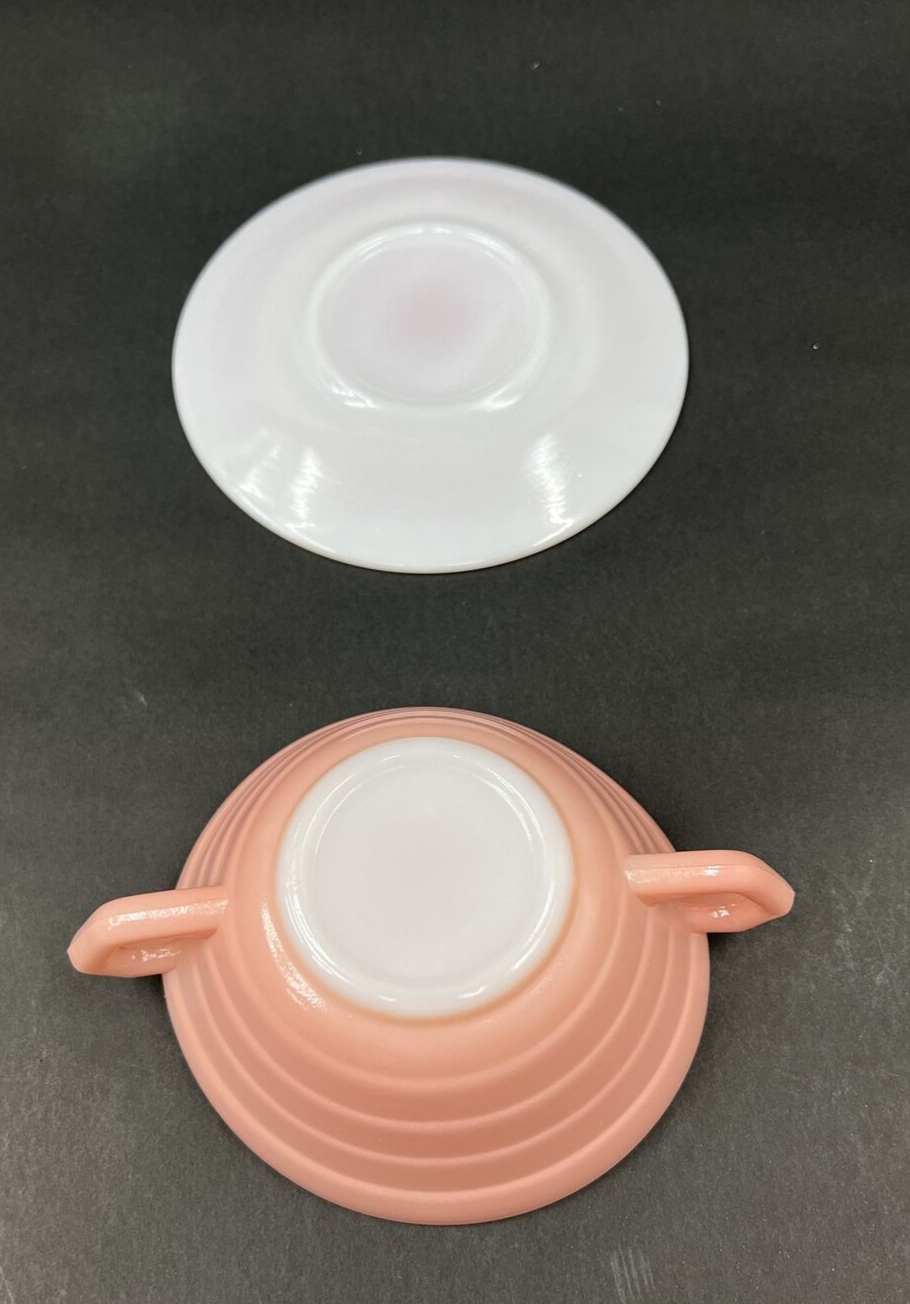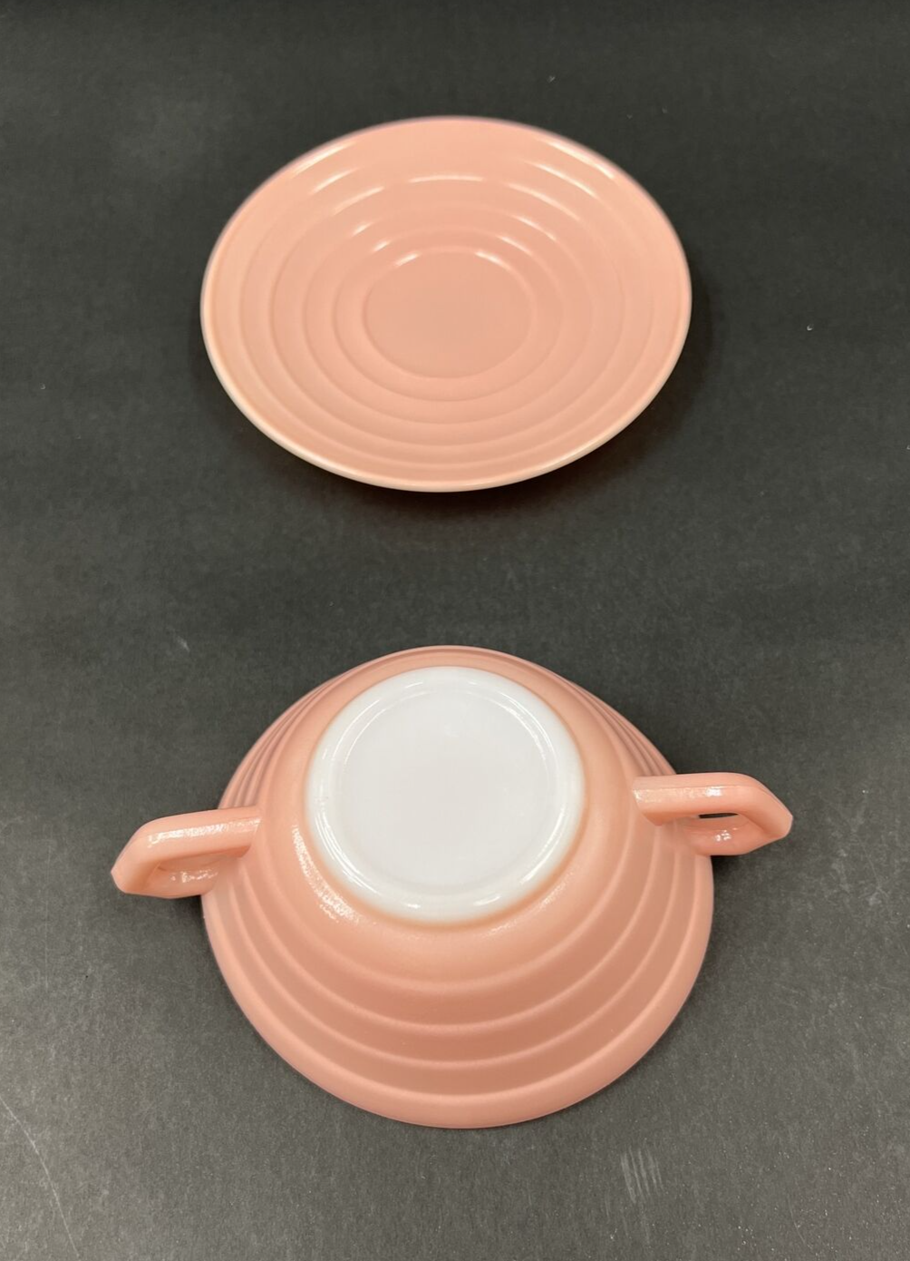 Hazel Atlas Moderntone Platonite Soup Bowl & Saucer Pastel Pink Vintage. This one looks like it was taken out before it fully cooled, it’s kind of got a little dipping in on sides so not a true circular shape.