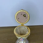 This Vintage Hinged Egg Trinket Box is a small, white oval-shaped box made of resin, inspired by Faberge. It features delicate flower patterns in a Victorian style, perfect for any room and all occasions. Hand-painted with a glossy finish, this trinket box is ideal for storing small treasures and can be a unique addition to any collection or decor. With its fairy tale and novelty theme, this original piece from the 1980s is suitable for teens, adults, kids, and girls alike. ** items music box part does not work**