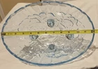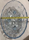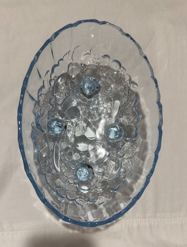 This vintage Indiana Glass serving bowl features a unique oval shape with a footed base, measuring 12.25 inches in length, 8.5 inches in width, and 4.25 inches in height. The bowl is made of blue glass with a glossy finish and a decorative fruit pattern called Blue Garland. Pictures do not do this piece justice. Excellent condition. Beautiful color.