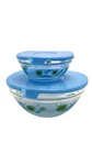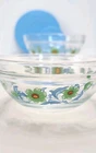 This set of two glass bowls with light blue plastic lids, adorned with a red & green floral pattern are a part of a larger 5pc set by Imperial home. These bowls are in good, functional condition, perfect for finishing off a set of simply using on their own. They do have some slight wear tho as shown in pictures & reflected in price. There are scratches on the lids & the larger one has some imperfections on the print. These are heat-resistant bowls & both have tight fitting lids. There are no chips, cracks, glass cloudiness, or repairs. The small bowl measures 1½" tall & 3¾" wide. The larger bowl measures 2½" tall & 5½" wide. These will ship with immense care, fast & FREE! If you have any questions or would like more pictures of a certain angle I may have missed just reach out & I will reply promptly. Thank you!