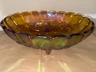 Add a touch of vintage charm to your home decor with this stunning iridescent carnival glass fruit bowl. The oval shape and marigold and amber colors make it a beautiful addition to any room. The Harvest Grape pattern and floral theme are perfect for a mid-century modern style. Crafted in Indiana in the mid-20th century, this original piece is a true gem. It measures 12 inches in length and 8.5 inches in width, making it perfect for serving fruits, salads, and other dishes. The bowl is made of high-quality glass and features a decorative design. Hand wash only to maintain its beauty.