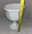 The product is a vintage Indiana Glass milk glass compote pedestal bowl in the Colony Harvest Grape pattern. This elegant piece is made of milk glass with a white color and features a colonial style design. The compote and pedestal bowl set is perfect for serving fruits or snacks in a decorative and vintage-inspired way, adding a touch of charm to any table setting. Made by the renowned brand Indiana Glass, this piece is a unique and timeless addition to any collection of decorative cookware and serveware.