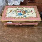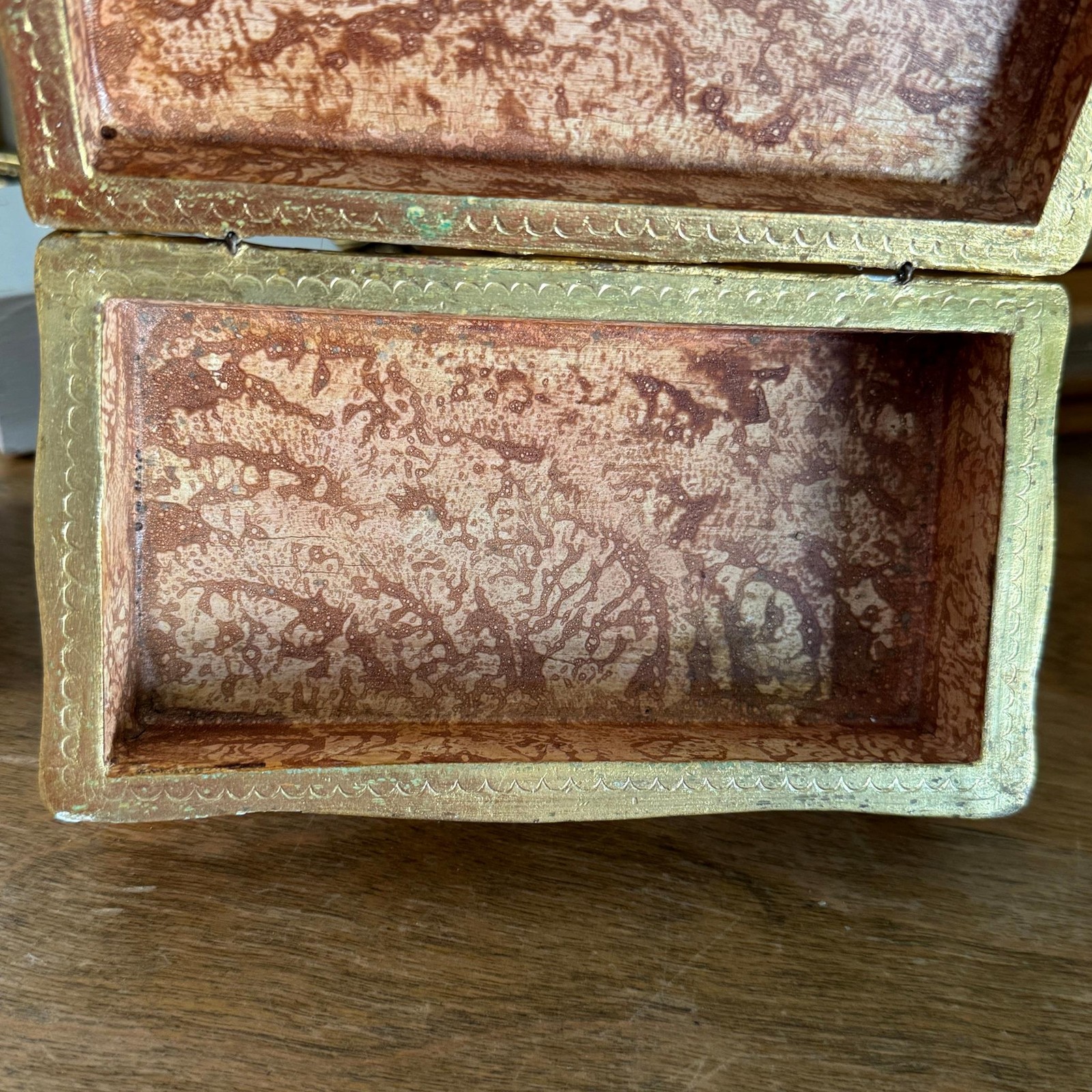 Vintage Italian Gilt & Pink Handpainted Floral Footed Wooden Box. A beautiful wood footed box from Florence Italy handpainted with a spray of flowers on top and gilt with pink detailing. Inside the box is handpainted and it is truly a joy to behold. This gorgeous handpainted and gilt wooden box has a condition issue with some of the gilt missing in a few places in the front and back. This wooden jewelry box measures approximately 7" wide x 2.4" high x 3.9" deep. Listing and template services provided by inkFrog