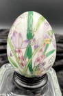 This vintage Japanese porcelain egg is a beautiful addition to any collection. The egg is hand-painted with delicate purple irises, green leaves, and a lovely floating butterfy, all surrounded by, and highlighted with, gold gilt. The egg stands at 2.7 inches tall and measures 2.1 inches in width. The egg comes with a wooden three-footed stand, adding to its charm and ease of display. Its weight is 3.2 ounces with the stand, making it easy to move and display in any room of your home. This is a beautiful egg in excellent condition. There are no chips, cracks or signs of wear. I have another egg of similar design, but with pink lotus flowers. If you would like both, I am happy to combine shipping and give you the savings. Please see my listing at 2cuddlebugs24. Thank you!