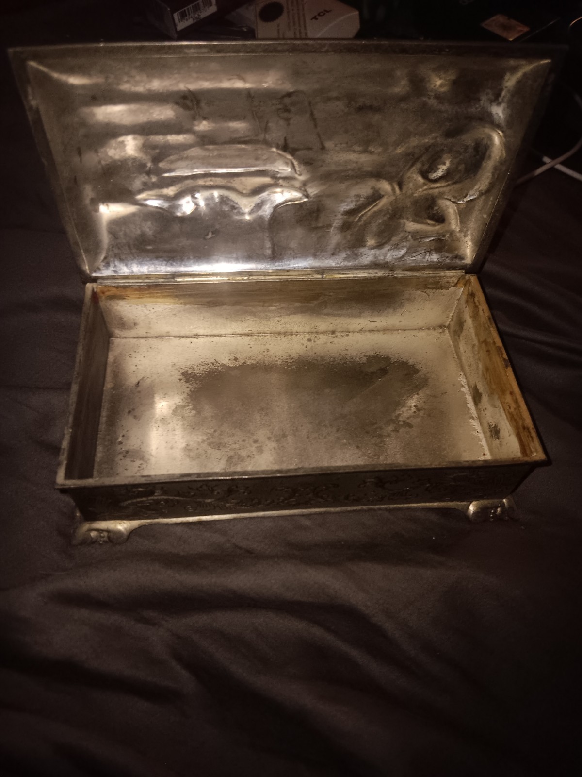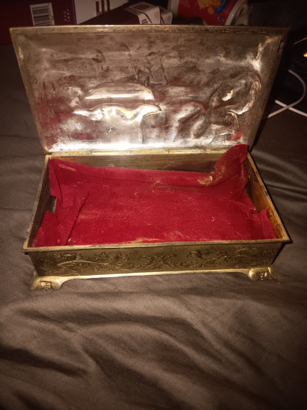 This vintage jewelry box from Japan is a rectangular-shaped piece crafted from metal with a silver color. It features a velvet lining to protect your precious jewelry items such as bracelets, rings, and earrings. With dimensions of 6.75 inches in length, 3.75 inches in width, and 1.25 inches in depth, this Japanese-themed jewelry box is perfect for organizing and storing your cherished accessories in a stylish and elegant way. Its vintage design adds a touch of nostalgia to your jewelry collection, making it a unique and eye-catching piece for collectors and jewelry enthusiasts alike.