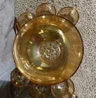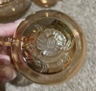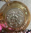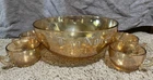 Add a touch of mid-century modern elegance to your table with this vintage Jeannette Marigold punch bowl set. The set includes a beautiful bowl and six cups, all made of clear glass with a gold trim. The round shape and glossy finish of the set make it perfect for all occasions, whether you're hosting a formal dinner or a casual get-together. Crafted in the United States in 1955, this original set is a rare find for collectors. The set is 9 1/4" in diameter and 4" deep, making it a perfect addition to any table. The gold trim on the bowl and cups adds a touch of sophistication to the set, making it a great conversation starter. Add this vintage punch bowl set to your collection today! Very good condition!