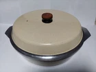 Will ship fast and protected. See photos for exact condition. Cleaned/sanitized and in good condition for its age. Chipping on the lid looks more like a manufacturer defect than damage from a ding because the enamel doesn't have jagged edges. The Kitchen Fair KF Cast Aluminum Double Handle Skillet is a vintage 14" yellow skillet with a lid, perfect for cooking on electric or gas stoves. This set includes a pot and lid, featuring a double handle design for easy transportation. Made of aluminum, this casserole pan/pot is an original piece from the brand KF, adding a unique touch to any kitchen collection.