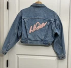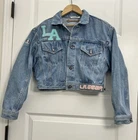 Double sided letterman Cropped, adjustable sides Pleated Pink Jeweled buttons Patches Inside graffiti In good preowned condition. The shoulder pad has an about an inch section that needs to be resown. Please see all photos. Follow for more.