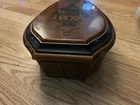 This vintage laquered box is a small, handmade trinket box made of wood. It features a boxing subject and a late 20th century design. The box is part of a collection of keepsake boxes, perfect for storing small items in any room. It has a lacquered finish and should be cleaned with a damp cloth. This unique piece is a perfect addition to any collection of decorative collectibles.