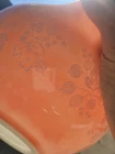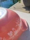 This vintage Pyrex pink gooseberry mixing bowl is a unique and collectible piece from the mid-20th century. Made in the United States, this 4 QT nesting bowl features a charming flower pattern and a glossy finish. Perfect for all occasions, this oven-safe and stackable bowl is a decorative addition to any kitchen. With its retro style and original design, this Pyrex bowl is a timeless treasure that embodies the nostalgia of mid-century modern decor. There are some scratches noticeable when held up to a light. Other than that, it displays beautifully and barely noticeable. Please refer to the updated pictures before buying. For that reason, I've lowered my asking price.
