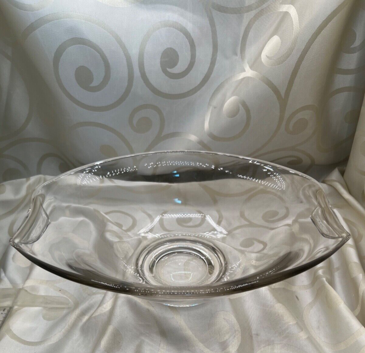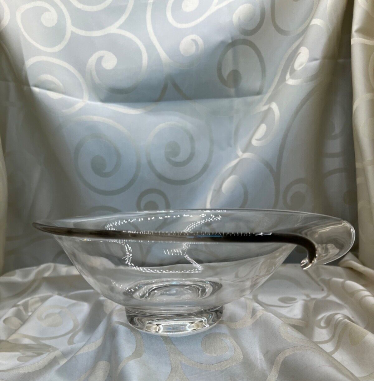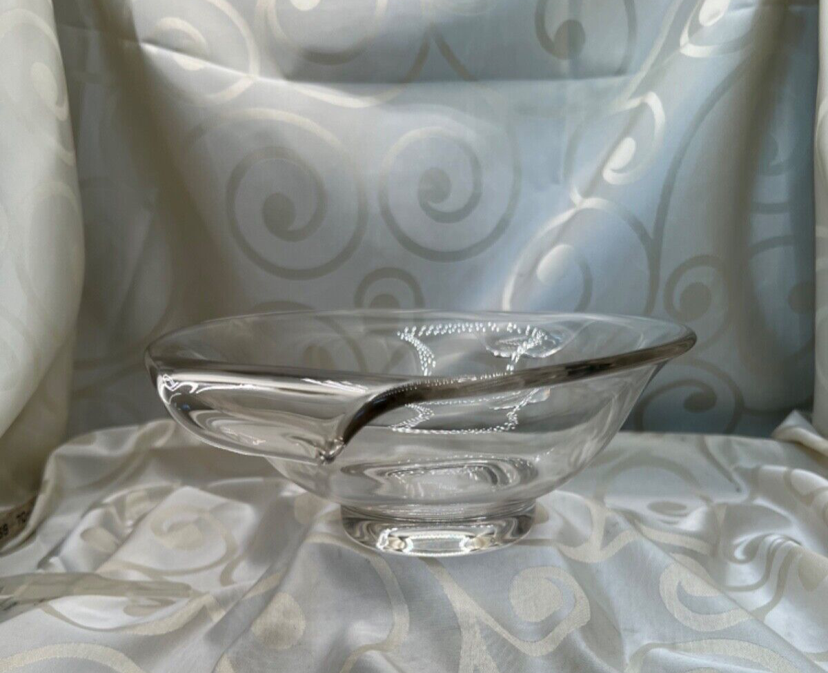 The Vintage MCM Stueben LOOK glass bowl with curved handles of rolled glass is a unique and elegant piece of decorative glassware. Made of clear glass, this unmarked bowl features a vintage pattern and stylish curved handles. Perfect for serving or displaying, this bowl adds a touch of retro charm to any kitchen or dining table. Its timeless design and quality craftsmanship make it a standout addition to any collection of pottery and glass.