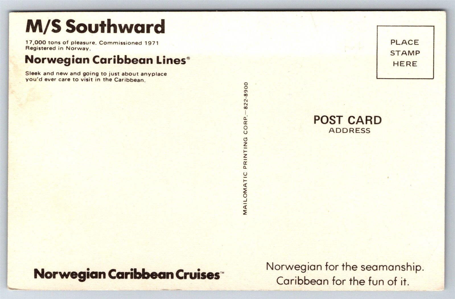 This vintage M/S Southward cruise postcard is a fantastic find for collectors! The standard 3.5x5.5 size is perfect for displays, and it arrives protected in a sleeve. Super fast shipping—mine was packed and sent within a day. The seller has an amazing selection and truly cares about customer satisfaction. A great addition to any postcard collection!
