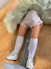 This Madame Alexander Maggie doll is absolutely stunning! Her vintage charm shines through—pristine saran wig, vivid face paint, and that iconic Maggie expression. The powder pink taffeta dress with lime green underskirt is gorgeous, and she’s been lovingly restrung for poseability. Minor scrapes don’t detract from her beauty. A flawless collector’s piece with new shoes, socks, and panties—sleepy glass eyes and delicate lashes complete her dreamy look. A true treasure!