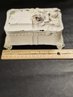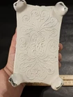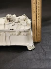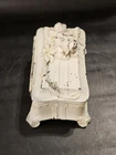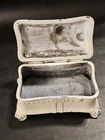 This vintage metal jewelry box with raised roses on top is a charming and unique decorative piece. Handmade in the mid 20th century, this original piece features a rectangular shape and a matte white finish. The raised roses on top add a touch of elegance, making it suitable for all occasions. Crafted of metal and cleaned with a damp cloth, this jewelry box is a timeless collectible that would make a lovely addition to any collection or display.