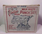 This is a beautiful vintage milk glass punch bowl set consisting of 27 pieces, all in the original box. The set includes a punch bowl and various matching accessories. The punch bowl and pieces are made of milk glass, giving them a classic and elegant look. Perfect for serving punch or other beverages at special gatherings or events.