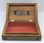 This vintage box is a beautiful work of art, crafted from wood and mother of pearl with intricate marquetry inlay. The box is a unique piece with multi-color designs that showcase a Moroccan style. It has a velvet lining that makes it perfect for storing small items. The box is an original and its primary material is wood. It is a perfect collectible for those who love decorative pieces.