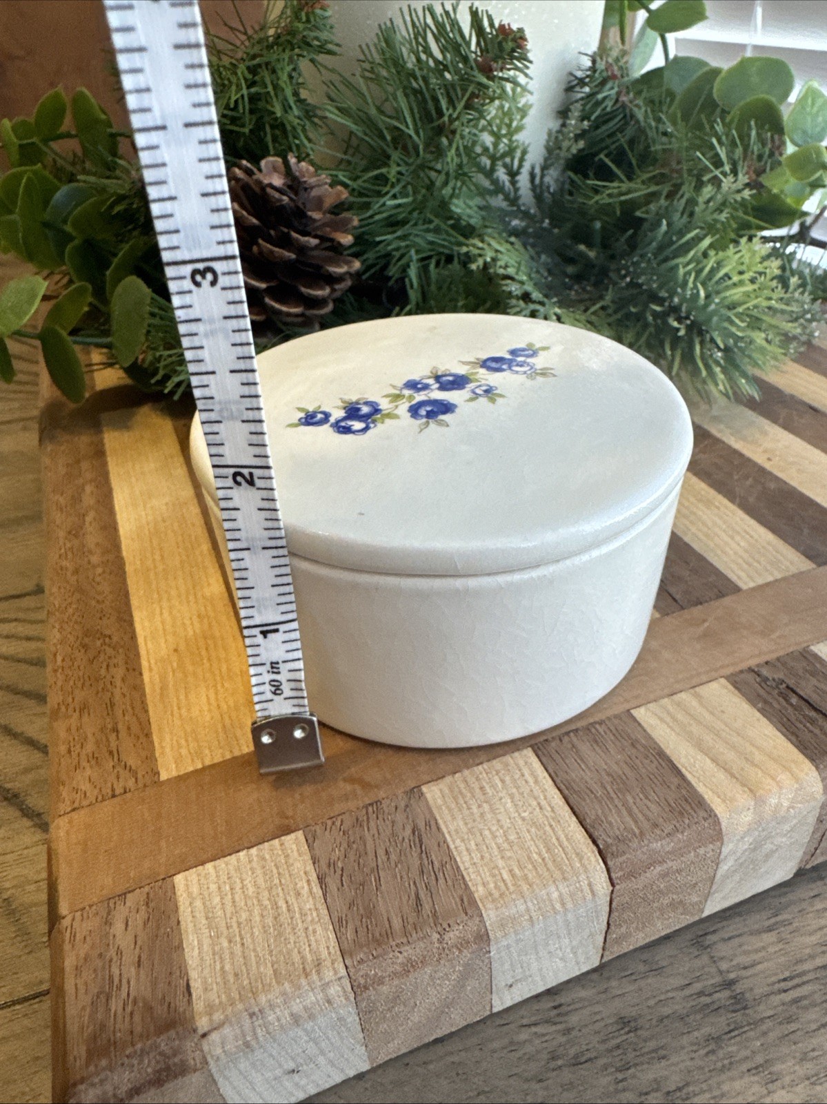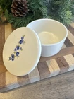 This vintage porcelain ceramic trinket dish features a floral pattern in a round shape, making it suitable for all occasions. With a white/ivory finish (notable crazing due to unknown age), this small trinket box is perfect for storing small treasures or jewelry. Made of porcelain and ceramic, it is easy to clean with a damp cloth and adds a touch of charm to any room with its beautiful small dainty blue floral pattern. Note: It appears white but not BRIGHT white,more off -white/ivory in person. No chips or cracks, but crazing is noted due to unknown age.