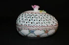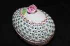 DRESSER BOX EGG POTPOURI HOLDER PORCELAIN VINTAGE HAND ENAMELED ROSES FINIAL 5" . Condition is Used but Excellent. Shipped with USPS Priority Mail. Hand enamelling is heavy and near mint. Colors are greens, reds, pinks, blues. Gold trim on base. Applied finial of Rose with Stem. 5" L x 3 11/2" W x 3 1/2" H Base of egg is slightly dimpled. Top is pierced for use as potpouri holder if desired.