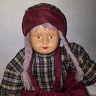 This beautiful vintage porcelain faced doll with purple yarn hair is a single unit antique collectible. The doll is 17 inches in size, with a girl doll gender and Caucasian ethnicity. Its blue eyes complement its light complexion and soft body features. The doll is sold without packaging, but its quality speaks for itself. This porcelain face doll is perfect for collectors or those who appreciate the beauty of antique dolls. Its straight hair and porcelain material make it a unique piece that is sure to impress. This doll is not just a collectible, but also a charming addition to any collection.
