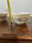 Embrace the charm of mid-century modern design with this vintage Pyrex Homestead mixing bowl. Crafted in the United States during the 1980s, the bowl exhibits a lovely blue and tan speckled pattern that adds a touch of nostalgia to any kitchen. The glossy milk glass fused construction ensures durability and a classic look, while the round shape and 1 1/2 pint (750 ml) capacity make it a practical choice for both everyday use and special occasions. The bowl features an impressed backstamp confirming its authenticity and origin. It's an ideal find for collectors of Americana, or anyone who appreciates the beauty of vintage kitchenware. With its timeless style and functional design, this piece is a true representation of the Homestead product line, offering a blend of aesthetic appeal and utility. **ONE BOWL HAS SOME SURFACE SCRATCHES ON THE INSIDE. SEE PICTURES!**