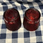This vintage ruby red hobnail glass votive candle holder is a small, round Art Deco style piece patented on July 11, 1939. It features a glossy finish and textured design, making it suitable for all occasions and any room in the home. Made of glass and measuring 2 1/2 inches in height, this original collectible comes in a set of 2 and weighs 2 lbs. Perfect for adding a touch of elegance to any space, this unique candle holder is a timeless piece from the early 19th century. You’re buying the set. One price