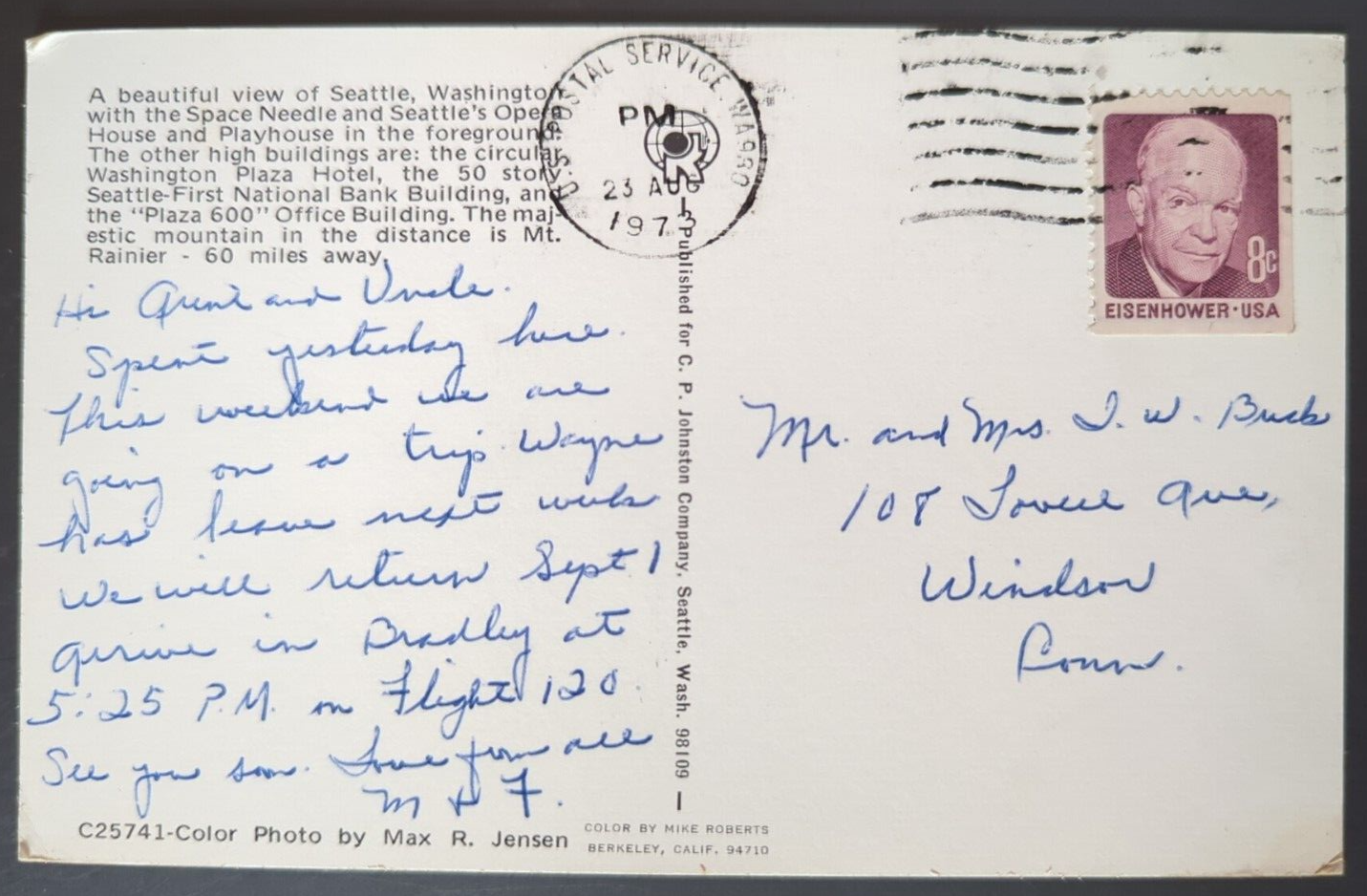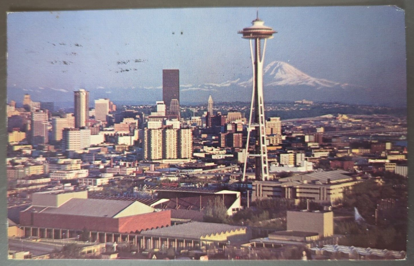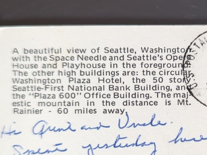 This vintage postcard captures Seattle’s iconic skyline beautifully, with the Space Needle and Opera House standing out. The aged look adds charm—minor wear, stains, or marks tell its history. Perfect for collectors who love authentic retro pieces. Photos show condition clearly, so you know exactly what to expect. A great little piece of nostalgia!