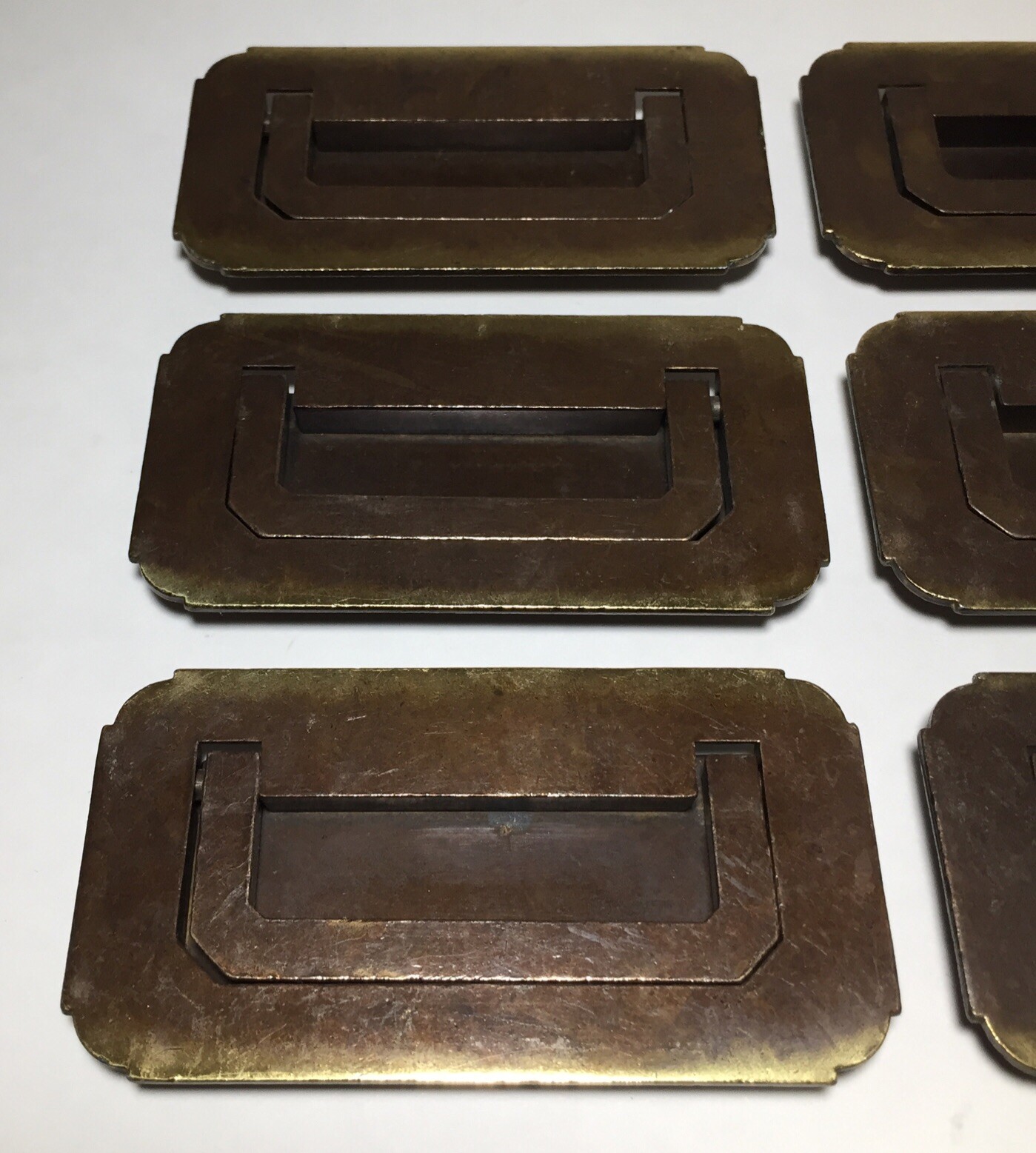 Vintage Set Of 6 Brass Drawer Cabinet Furniture Fold Out Handle Pulls. The handles are in good useable condition. The screw mounts on the back are 3” apart. All of the measurements are shown in the pictures. Please feel free to ask any questions. The lot will ship out safely and securely the same or next business day.