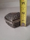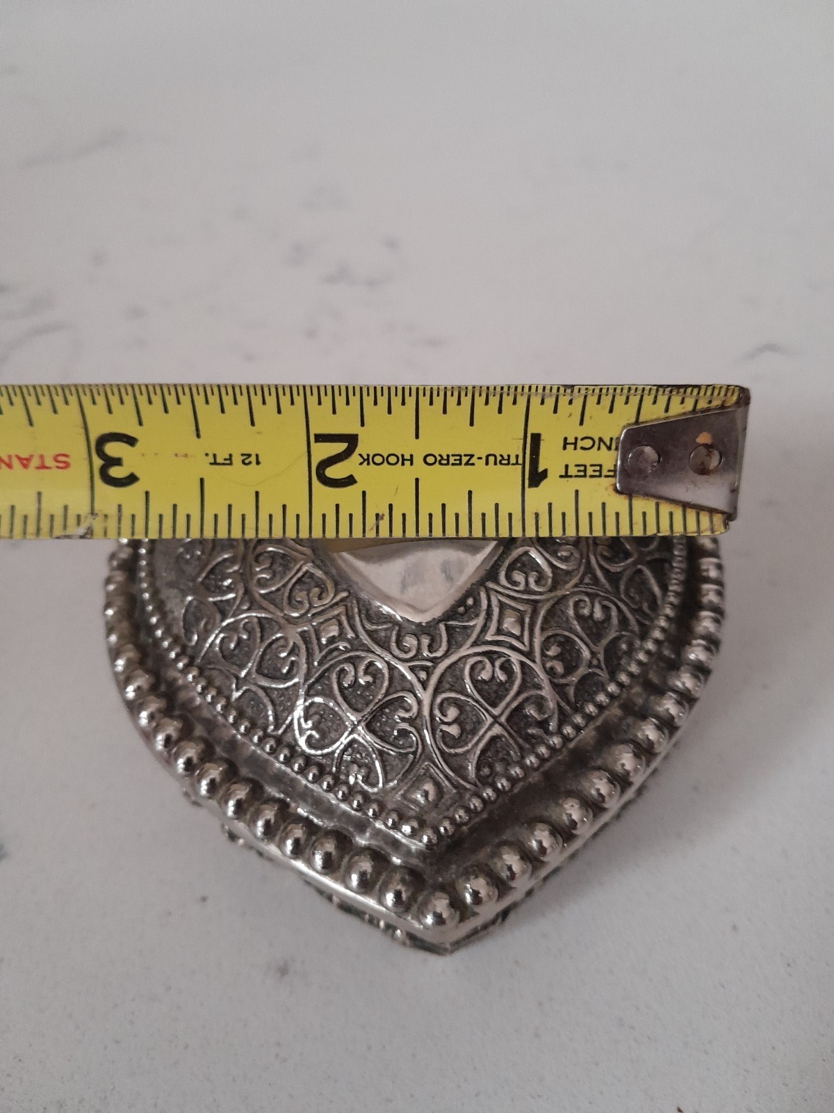 This vintage silverplated trinket box in the shape of a heart is a charming collectible piece adorned with a purple velvet lining. The ornate design and intricate pattern of hearts make it a visually appealing item for storing small treasures. This trinket box is perfect for adding a touch of elegance to any vanity or dressing table, making it a lovely decorative piece for those who appreciate vintage and unique items. Great Condition