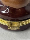 vintage Silvestri Teddy Bear Trinket Box, made of brown porcelain. It features a hinged lid for storing small items like jewelry. The design includes a teddy bear with painted stitched seams and a painted red bow tie. It measures approximately 3.5 inches tall and 2.5 inches wide. It is a collectible item, often sought after by enthusiasts. No box Please see pictures for description and condition of this vintage item.