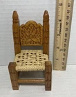 This vintage small doll chair is a unique piece of furniture that is perfect for doll collectors. It is hand made and carved out of wood, with a jute seat that adds to its antique style. The chair is of brown colour, 4 3/4 inches in height and is an original piece, not a reproduction. The chair's style and material make it a great addition for any dollhouse or furniture collection. This is a vintage piece that is in overall good shape. It has some minor wear on the jute string seat. This chair is a must-have for antique enthusiasts and collectors who appreciate handcrafted items. The item will ship out safely and securely the same or next business day.