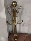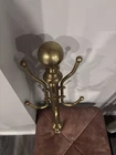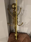 Vintage wall-mounted coat rack made of solid brass. Features multiple curved hooks with a classic hall tree design, perfect for coats, hats, or bags. Heavy, well-built piece with a warm aged patina that shows light wear consistent with age. No maker’s mark found. Likely mid-20th century decorative or entryway hardware. Mounts securely to the wall and works great as both functional storage and vintage décor. Condition is good overall with normal surface wear and patina—no bends or breaks. Please see photos for details.