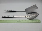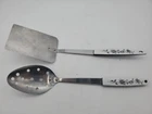 Add a touch of vintage charm to your kitchen with this set of stainless steel serving utensils. The set includes a slotted spatula and spoon, both with a beautiful floral pattern in silver, black, and white. Slotted spoon is 12" long and spatula is 12.5" long.