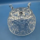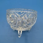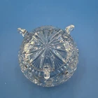 This is a vintage decorative bowl made of clear glass with a floral sunburst cut design. It is footed and likely used as a dessert bowl. The production style is cut glass, giving it a detailed and intricate look. The brand is unmarked, adding to its charm and mystery as a collectible piece. Pre-owned excellent condition. No original box. No cracks or damages. Please check the pictures carefully as part of the description. Feel free to ask questions if you need more information before you buy it. Thank you for your interest B-10