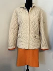 This vintage Tommy Hilfiger jacket is a must-have for any fashion-forward woman. The cream-colored coat features a diamond quilted pattern and is made from softshell polyester fabric. It has a full zip closure with buttons and accents that add a touch of elegance to the jacket. The mid-length coat is perfect for the fall, winter, and spring seasons and can be worn for various occasions, including travel, casual outings, workwear, and business meetings. The jacket is machine washable, making it easy to care for. The jacket is a classic fit and comes in size XL. The grandma-inspired theme makes it perfect for outdoor activities and preppy style. This is not thick like a winter coat. :-)