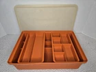 Tuppercraft set is in good used condition and was closely inspected, washed, cleaned and tested. See pictures for full details! Elevate your kitchen storage with the charm of vintage Tupperware. This 4-piece set, model 1421-4, comes in a vibrant burnt orange hue that adds a touch of retro flair to your organization. Each piece measures 12 inches in length and 8 inches in width, offering a spacious solution for your kitchen needs. Crafted in the United States during the 1970s, the set is a testament to classic design and durability. It features a robust plastic construction, complemented by a secure lid to keep your items fresh and safe. The set includes four reusable inserts, making it easy to categorize and quickly find contents. The easy-clean surfaces and 13 convenient slots make this Tupperware set a practical addition to any kitchen collection.