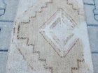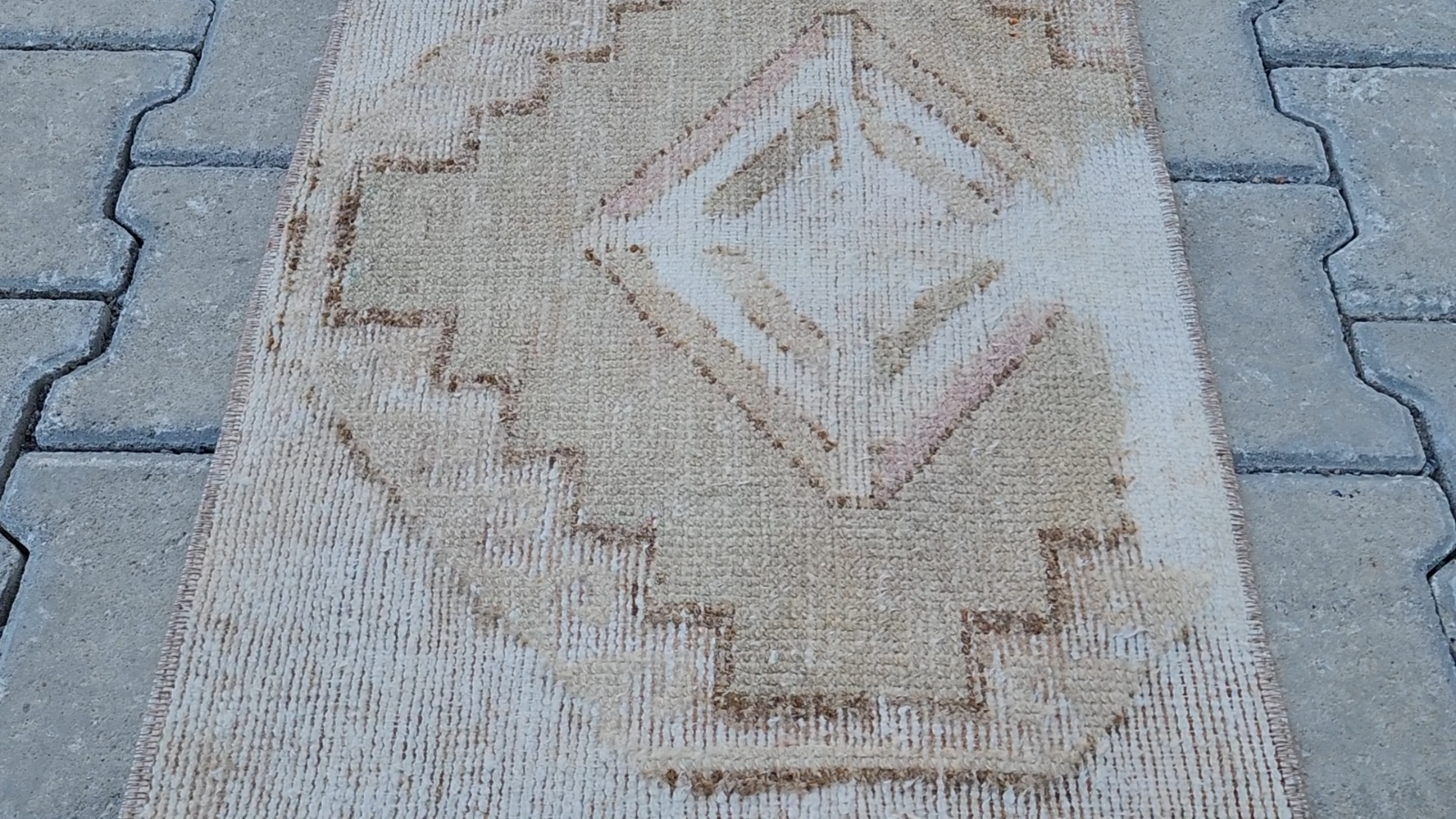 Turkish Oushak Rug – 1.7x3.4 ft, Beige and Yellow, Minimal Geometric Design Vintage Handwoven Wool Rug – Neutral Washed Aesthetic for Entryways or Decor Corners This vintage Turkish rug features a soft beige field with a central geometric diamond medallion in pale yellow and taupe tones. With its minimal pattern and sun-washed appearance, this piece is perfect for serene, neutral, or Scandinavian-inspired interiors. Handwoven from 100% wool and dyed with plant-based pigments, it’s ideal for layering, bedside accents, or hallway styling. Product Details: 📌 Origin: Turkey 📌 Material: 100% wool, vegetable dyed 📌 Weaving: Hand-knotted 📌 Pattern: Central diamond medallion 📌 Colors: Beige, soft yellow, washed taupe 📌 Condition: Gently faded / washed vintage condition 📌 Size: 52 x 104 cm (1.7 x 3.4 ft) 📌 Shipping: Free worldwide shipping in 1–3 business days 📌 Returns: 30-day return policy 💬 Message us for any inquiries!