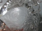This is a beautiful cut crystal glass 3 footed bowl in nice condition. There are 2 small chips on the very bottoms of 2 of the feet which can't be seen when displayed. No other chips or cracks. It is deeply cut with a quality design of flowers on 3 panels. I don't see any maker's marks. It is approx. 6in. across and 3 5/8in. deep. It turns green under UV light. GREAT item to add to your collection, decor or existing set. Thanks for looking.