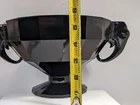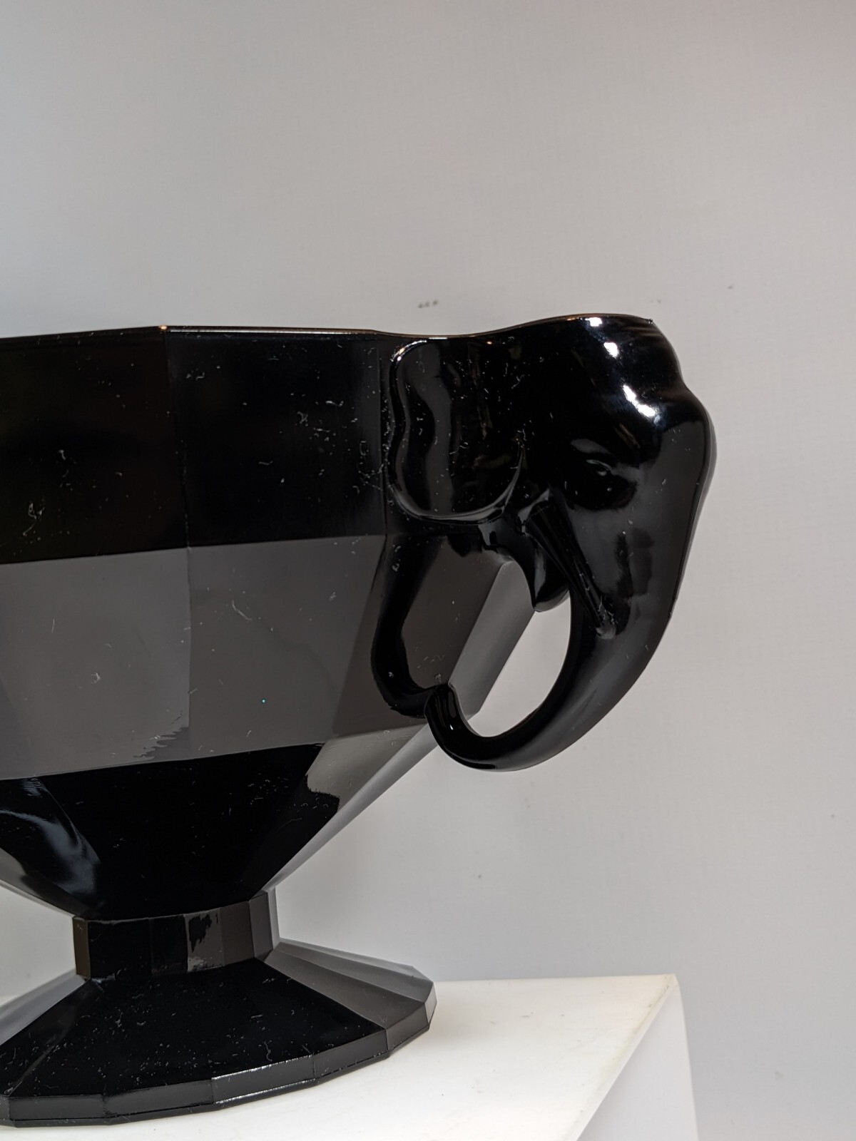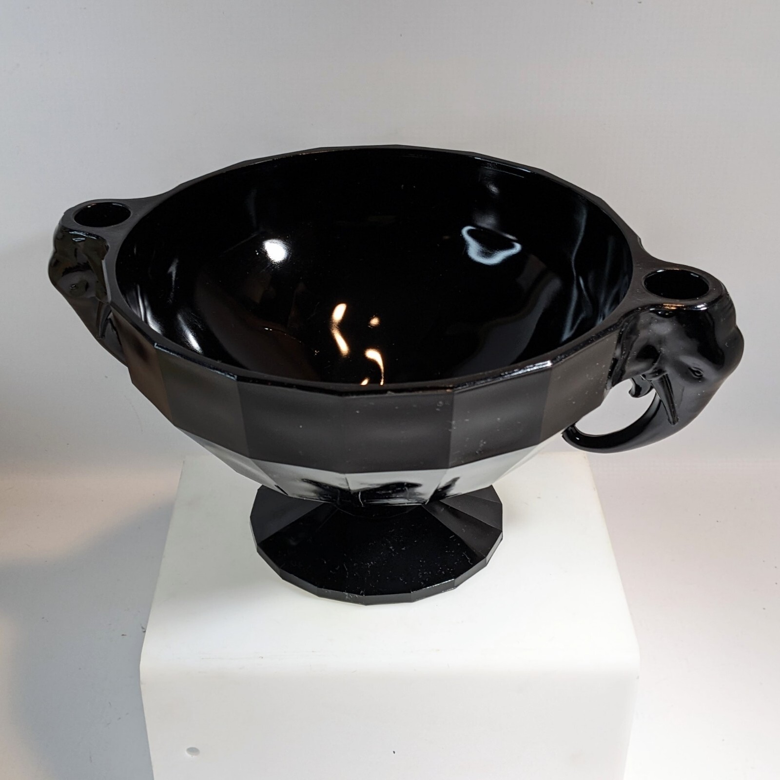 This is a footed glass console bowl with two elephants that serve as both candle holders and handles. The candle cups are just about 1" at the openings. As far as it's origin - bowls in this form were produced by Westmoreland glass and Summit Art Glass. Due to that it is unmarked, I would lean that it came from Summit, but admittedly I am not 100% sure. The glass looks black until you get it near some light, and then you can clearly see the deep amethyst coming through. There is no damage to point out, but I do see a line 2" "scratch" in the center of the bowl. Very interesting and eye-catching centerpiece! Measures approx. 5.5" in height, Top 8" in diameter without Elephants, each Elephant is 3.5" in height, Base 4.5" in diameter Good pre-owned condition no chips or cracks minor blemishes please see pictures. Thank you for considering this item! We hope you find exactly what you're looking for. However, we also invite you to take a moment to browse through our entire store. We have a wide range of listings featuring unique and interesting items that might catch your eye. From rare collectibles to everyday essentials, our store is filled with surprises waiting to be discovered. Take a look around and see what other treasures you might find!"