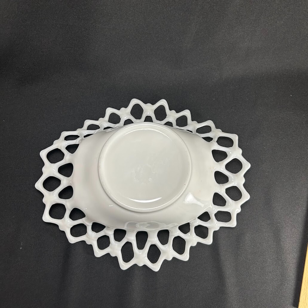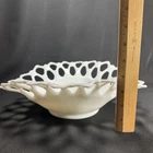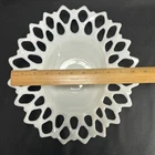 The Vintage Westmoreland Milk Glass Doric Open Lace Oval Fruit Bowl is a stunning piece of American-made decorative cookware from the Westmoreland brand. This white, glossy bowl features a beautiful Doric pattern and a laced edge design, adding a touch of elegance to any table setting. With its oval shape and vintage charm, this glass bowl is perfect for serving fruits or candies in a stylish and timeless manner. Hand wash only to preserve its delicate finish and appreciation for its classic design.
