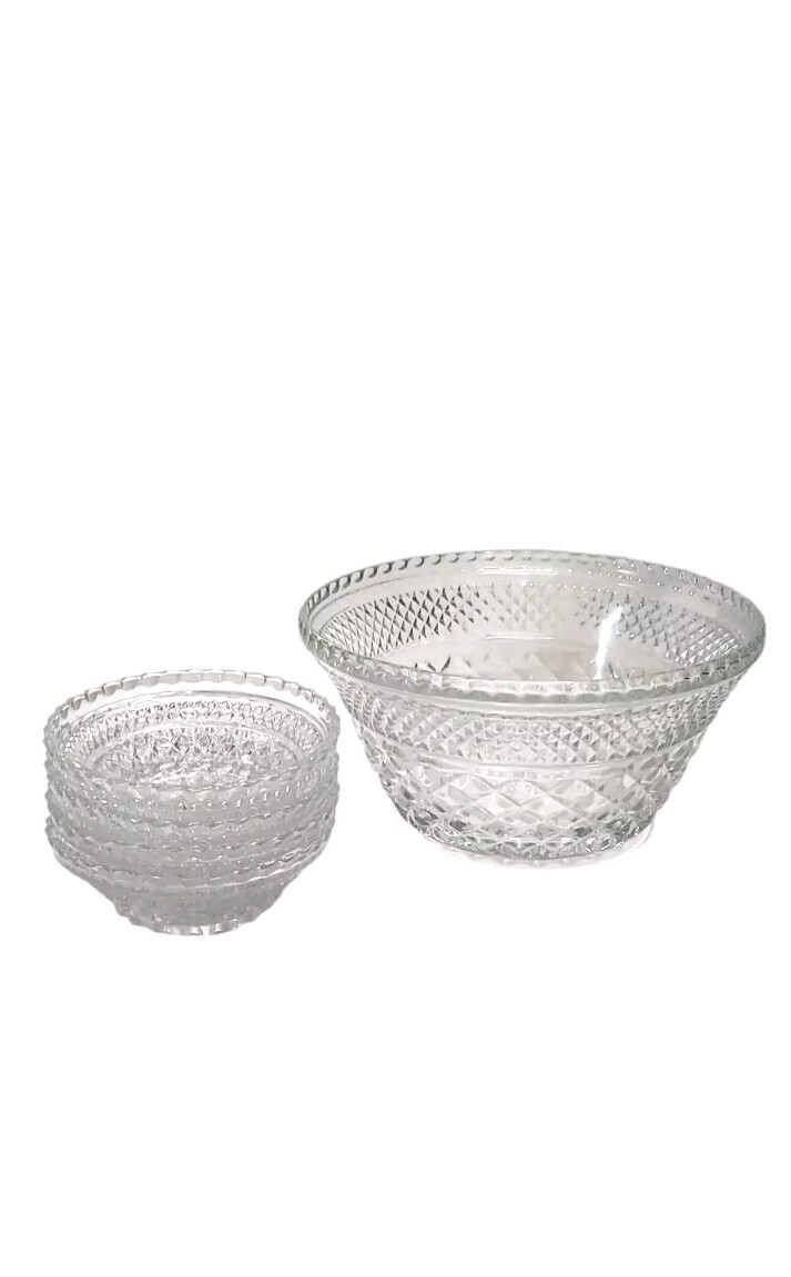 Vintage Anchor Hocking Wexford 5pc Serving Set made from the 1960s to the early 90s. This set includes four small Berry Dessert Bowls & one large Serving Bowl, all made of clear pressed glass. The design features a retro Mid-Century Modern style & is 100% functional & displays beautifully. All bowls are in excellent condition! The large bowl measures 9½" wide & 5" tall. The small bowls each measure 5¼" wide & 1½" tall. Manufactured by Anchor Hocking in the United States, this set is a charming addition to any kitchen or dining room. These will ship with immense care, fast & FREE! If you have any questions or would like more pictures of a certain angle I may have missed just reach out & I will reply promptly. Thank you!