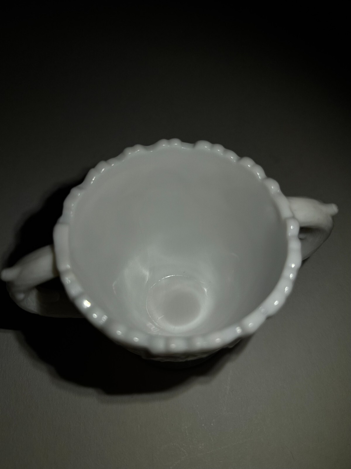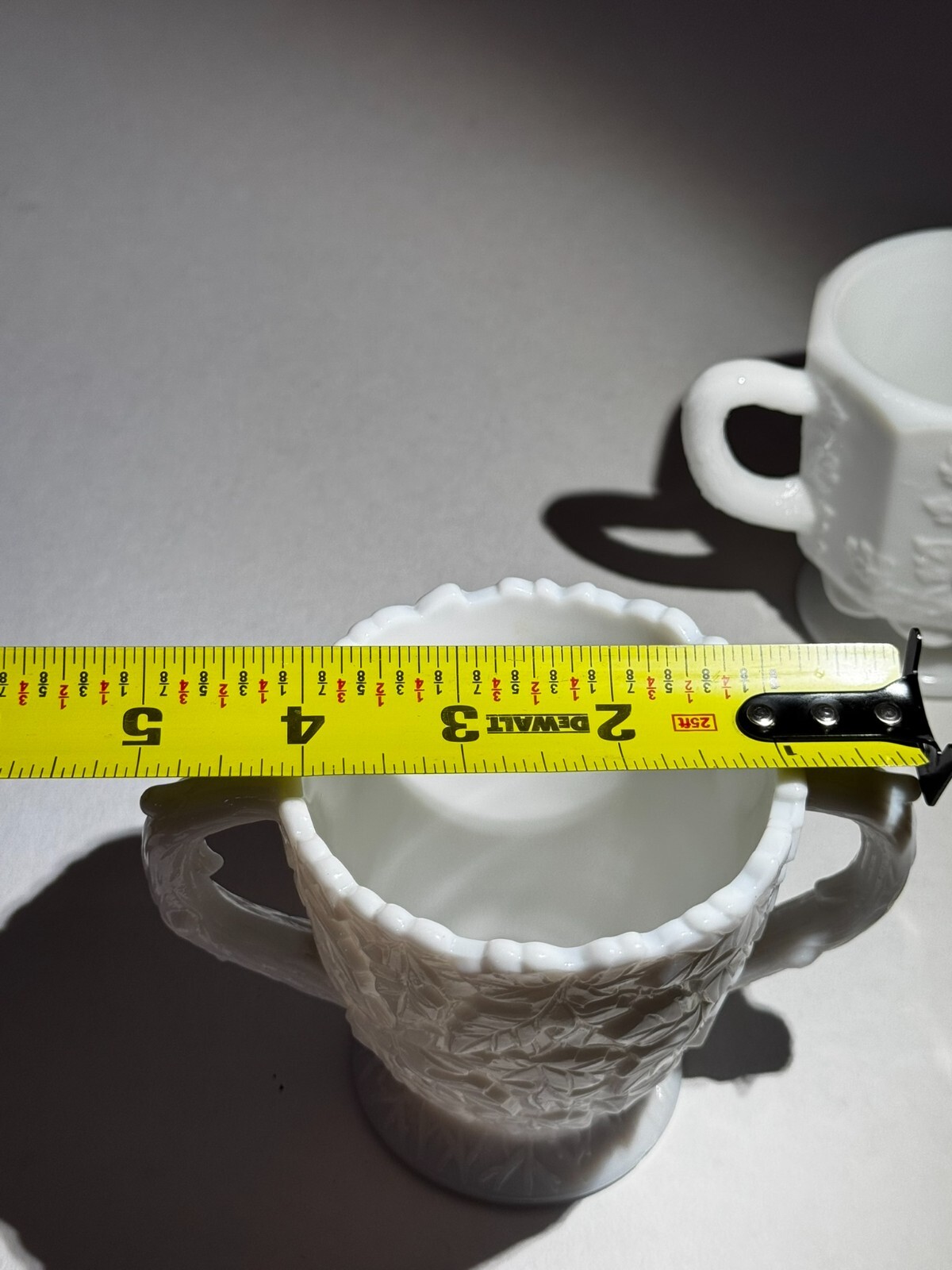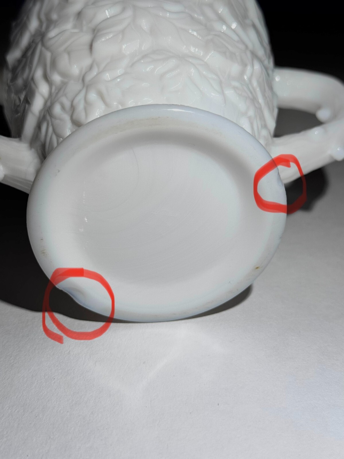 This is a vintage white milk glass sugar bowl featuring a Bramble leaf pattern. It has a high relief decoration, two handles, and is hand wash only. The item is 3 1/2" in height and 5 1/4" wide from handle to handle. It weighs 14 oz.
