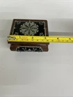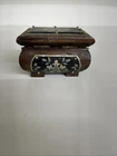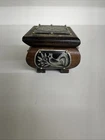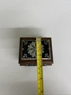 Please note - we offer free, no questions asked returns on most items. Please check the return policy. Please see all photos and thanks for looking! Charming vintage wooden trinket box with black inlay panels featuring a delicate silver floral design. The box is accented with small brass studs and rests on four small feet. The inside of the lid bears a metal “Warszawa” plaque, indicating it was made or purchased in Warsaw, Poland. Details: • Material: Wood, metal inlay, brass studs • Design: Black panels with silver floral motif • Origin: Warszawa, Poland Good vintage condition - light wear consistent with age and use.