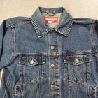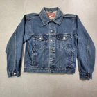 This vintage Wrangler denim jacket is a must-have for any fashion-savvy man. With a solid blue color and short length, it's perfect for any occasion. The jacket features a spread collar, button closure, and accents that give it a unique look. Made of high-quality cotton denim, it's comfortable and durable. The jacket is a size medium and has a regular fit. It's perfect for men who want to add a touch of style to their wardrobe. Whether you're going out with friends or running errands, this jacket is sure to turn heads. Don't miss out on the chance to own this one-of-a-kind piece.