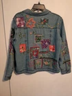 This vintage Coldwater Creek jacket is a unique piece that features a patchwork of floral embroidered denim. The jacket has a short length with long sleeves and a collared neckline. It is made of cotton outer shell material with a polyester lining and insulation material. The jacket is decorated with button closure and decorative buttons that add a bohemian touch to the overall look. The jacket is a regular fit and is available in petite size. This item is a must-have for any vintage clothing enthusiast.