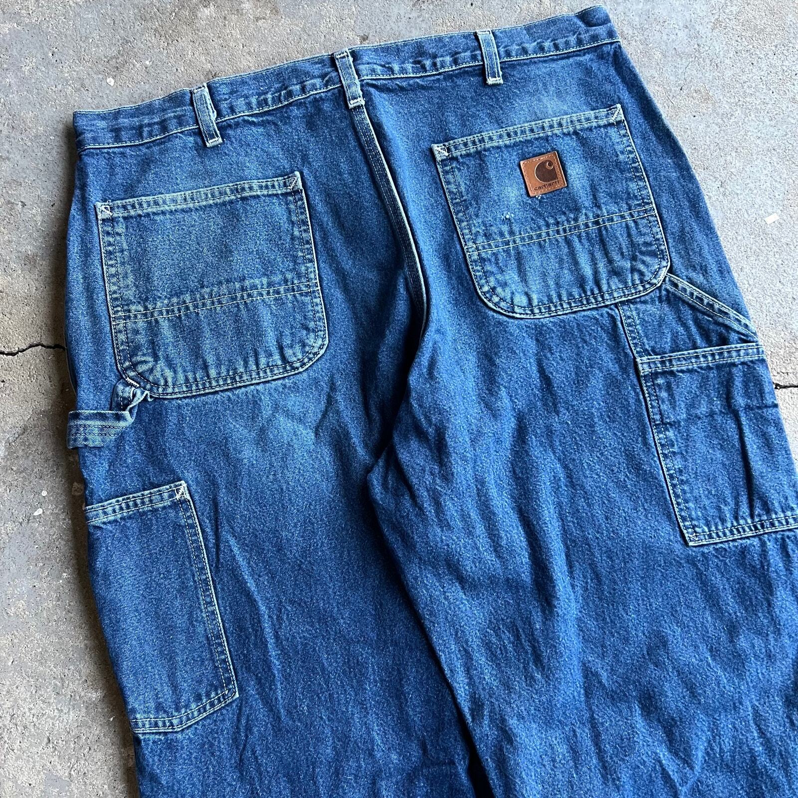 Vintage Y2K blue Carhartt denim jeans work wear carpenter pants. Great pair. Measure 36x32.5 and a 9.5 leg opening. Please check measurements before purchasing. I do my best to show any flaws in pictures. Quick shipping! Bundles encouraged! @ants_haul on Instagram. 445!!!