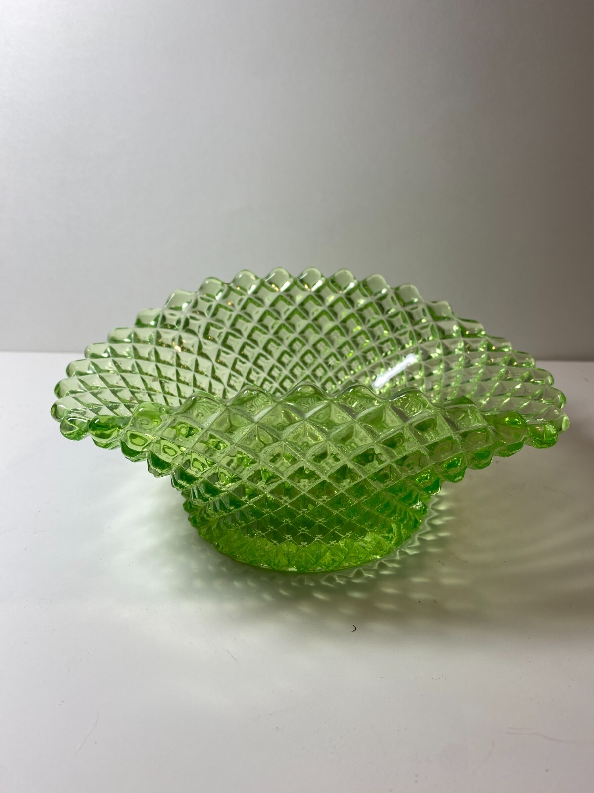 The product is a green hobnail sawtooth edge 8 x 5" depression glass candy or nut bowl. This unmarked bowl is made of glass and features a charming design with a sawtooth edge and hobnail texture. Perfect for serving candies or nuts, this bowl adds a touch of elegance to any table setting with its beautiful green color and unique design.