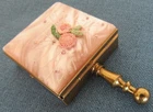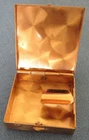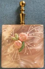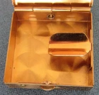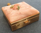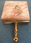 Offered is a vintage personal ashtray box for the sophisticated female socialite! An unused, hinged gold-tone box with handle that opens to show a single cigarette cradle. The lid is decorated with embroidered roses and tiny sparkly stones set in the undamaged pink base. Box without handle measures 1 1/2 inches square. GREAT little trinket to prance about a gathering with in one hand, while holding a long stemmed cigarette holder in the other! See photos.
