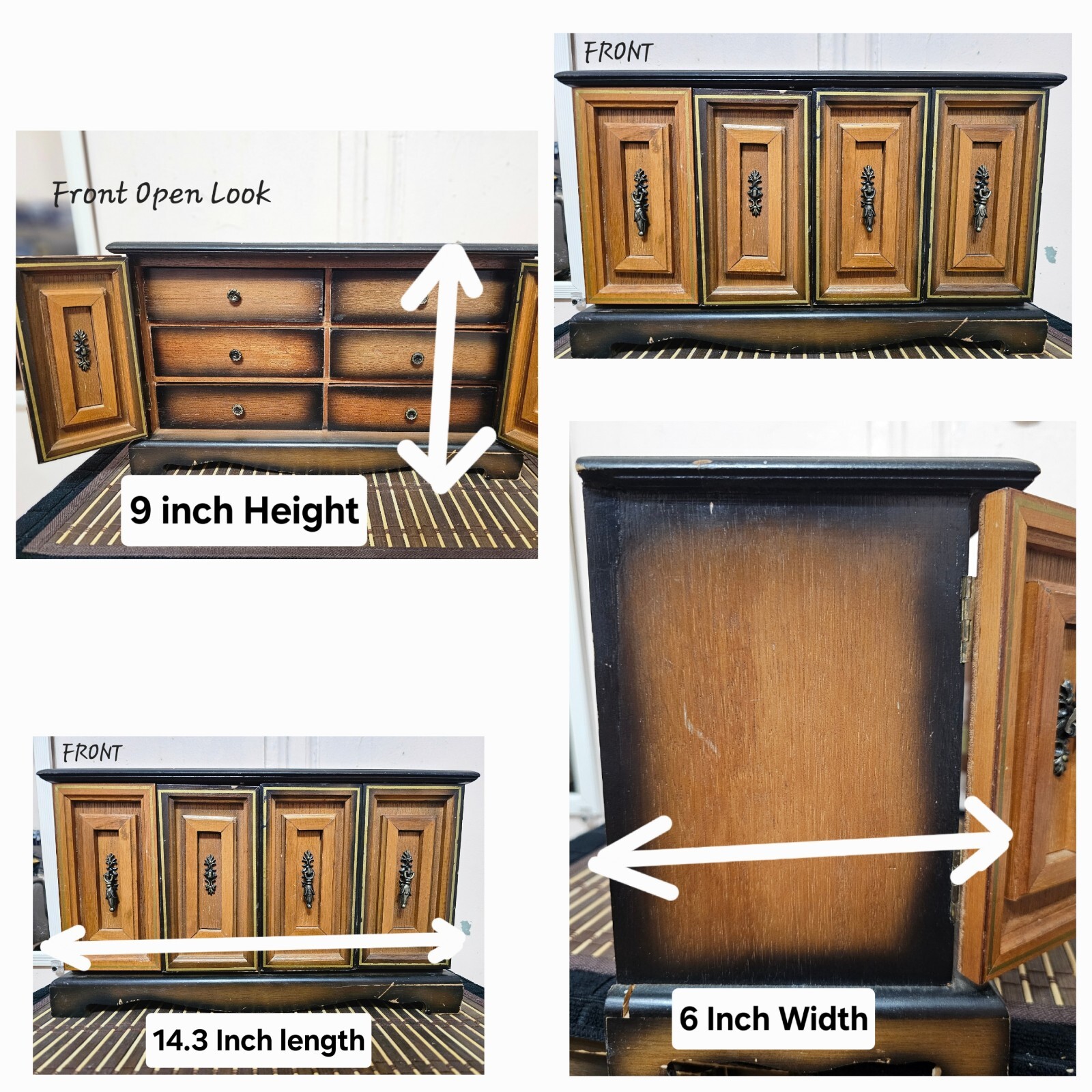 Vintage 1950s Wooden Jewelry Box β Made in Japan | 6 Drawers + Music Mechanism π Timeless Vintage Jewelry Box β Rare Find! This beautiful 1950s wooden jewelry box, crafted in Japan, is a classic storage solution for your treasured accessories. Made from solid wood, it features six drawers, two side doors, and a built-in music mechanism that plays a charming tune. π Key Features: βοΈ Authentic Vintage Design β Elegant woodwork with intricate metal handles. βοΈ 6 Spacious Drawers + 2 Side Doors β Perfect for organizing jewelry & keepsakes. βοΈ Plays Music Beautifully β A nostalgic tune adds to its charm. βοΈ Durable Solid Wood Construction β Sturdy and built to last. βοΈ Unique Decorative Piece β A collectorβs dream or a stylish organizer. π Measurements: Jewelry Box: 9" (H) Γ 14.3" (L) Γ 6" (W) Each Drawer: 6.5" (L) Γ 4.5" (W) Γ 2" (H) π Condition: Gently used with minor scratches due to age β adds to its vintage character. π Perfect for vintage lovers, collectors, or as a unique gift!